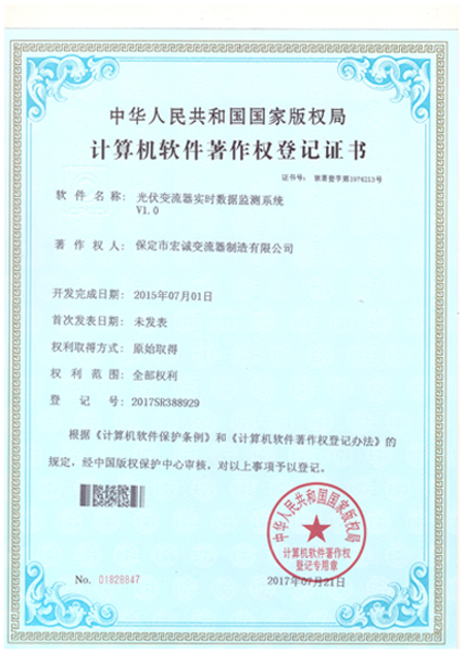 計算機軟件注冊權(quán)登記證書——光伏變流器實時數(shù)據(jù)檢測系統(tǒng)V1.0