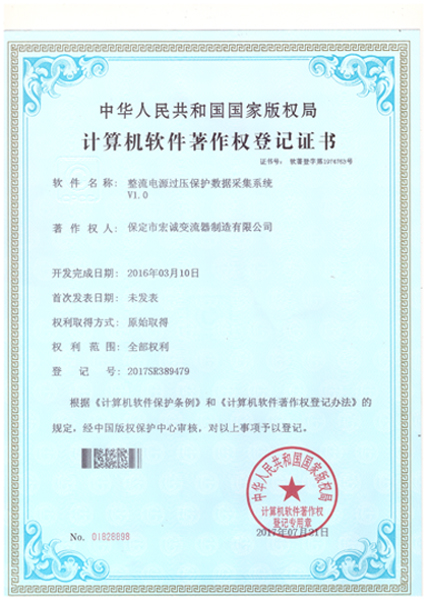 計算機軟件注冊權(quán)登記證書——整流電源過壓保護數(shù)據(jù)采集系統(tǒng)V1.0