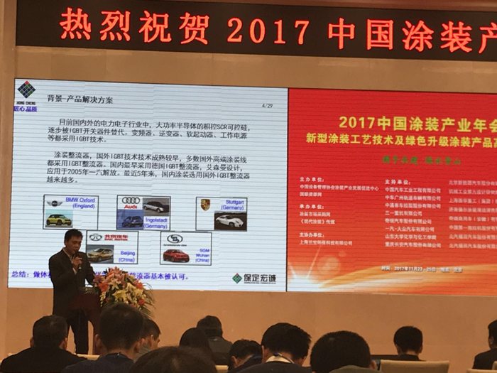在年會上,我司總經(jīng)理袁世鋒先生以“涂裝電泳安全及節(jié)能的解決新方案——IGBT模塊電源”為題進行了演講,重點介紹了IGBT模塊電源的發(fā)展,原理及應(yīng)用?,F(xiàn)場展示了保定宏誠為汽車涂裝行業(yè)服務(wù)過的項目成果。